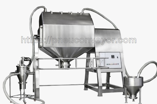 Pneumatic Automatic powder charging system is provided duly mounted on a swivelling davit interlocked with sensor to safeguard against blender. It is provided with a SS suction nozzle coupled to a flexible PVC food quality conveying pipe to enable for direct suction of the powder from container which will be discharged in blender and on complete charging of batch or maximum upto 70-80% by volume, filter bag of charging system may automatically be cleaned by auto reverse pulse jet mechanism thereby safeguarding against operator dependency, charging system may be swivelling on side and locked in that position which will actuate the sensor for that position, a dummy cover to be clamped on charging hole & homogeneous blending action can be initiated by starting the blender operation. After necessary blending period the material can be discharged & collected from bottom into container by manually opening the butterfly valve. The entire auto charging system is a tool free assembly.